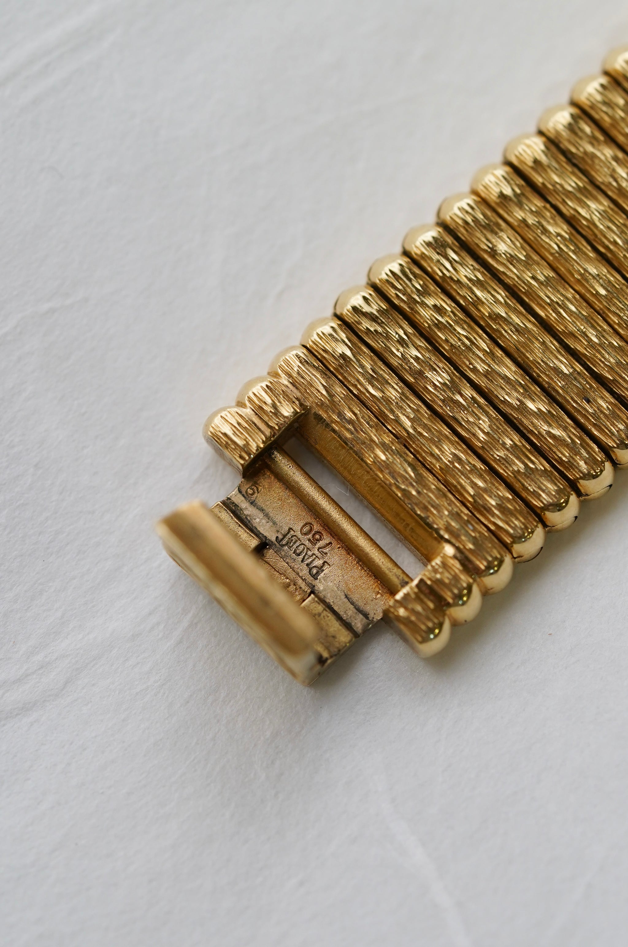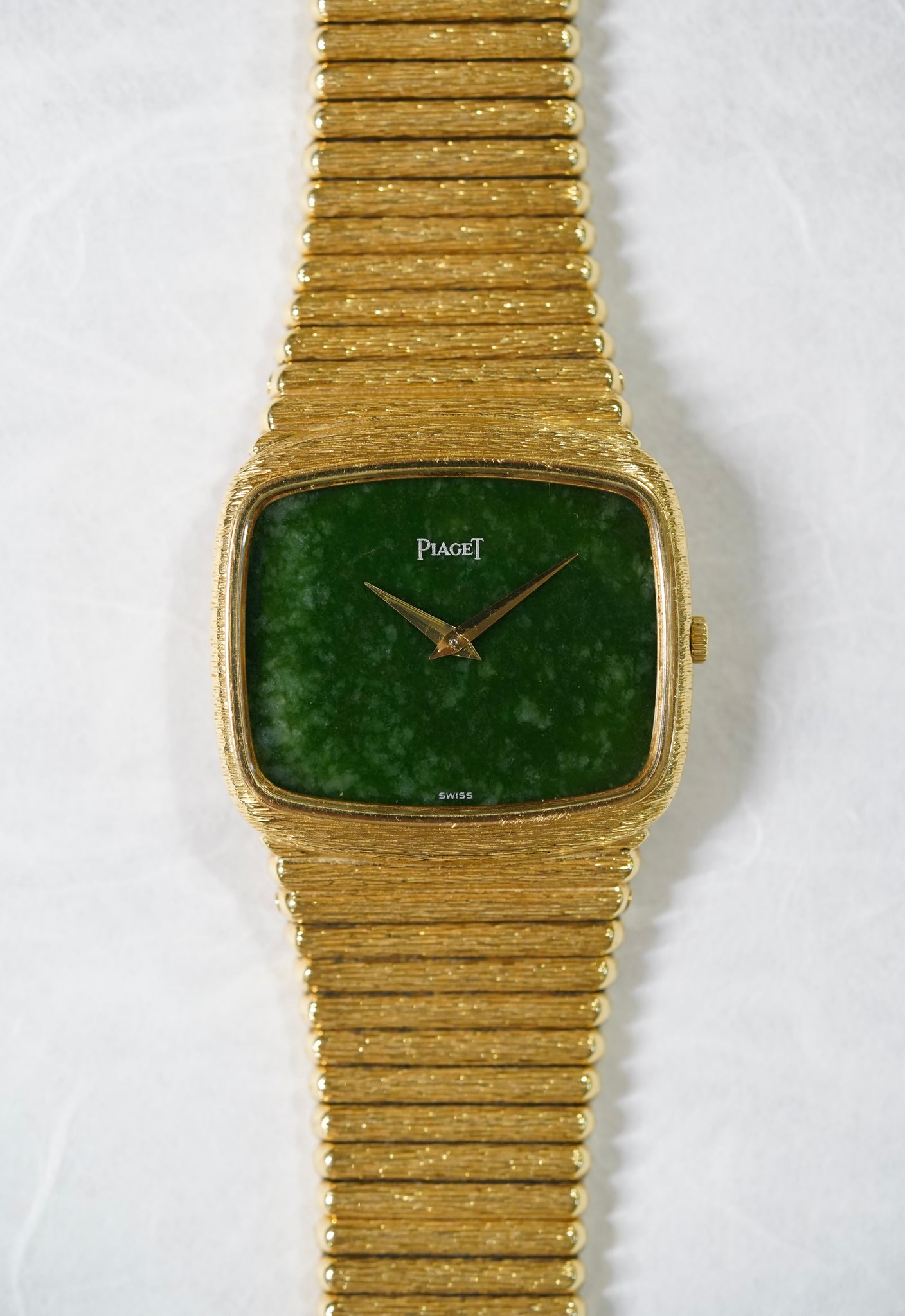 Piaget and Stone dials are match made in heaven. Combine that with over 150g of beautiful bark finished yellow gold, we are taking about upper echelon Golden Nugget. The jade dial, cut to an extraordinarily thin profile, offered a deep green luster, rather deeper in colour than malachite, contrasting beautifully against the warmth of 18K yellow gold cases and integrated bracelets. While Piaget produced a range of hard-stone dials within the Emperador line this Jade dial is definitely a standout piece, a watch that turns your head around when passing by.