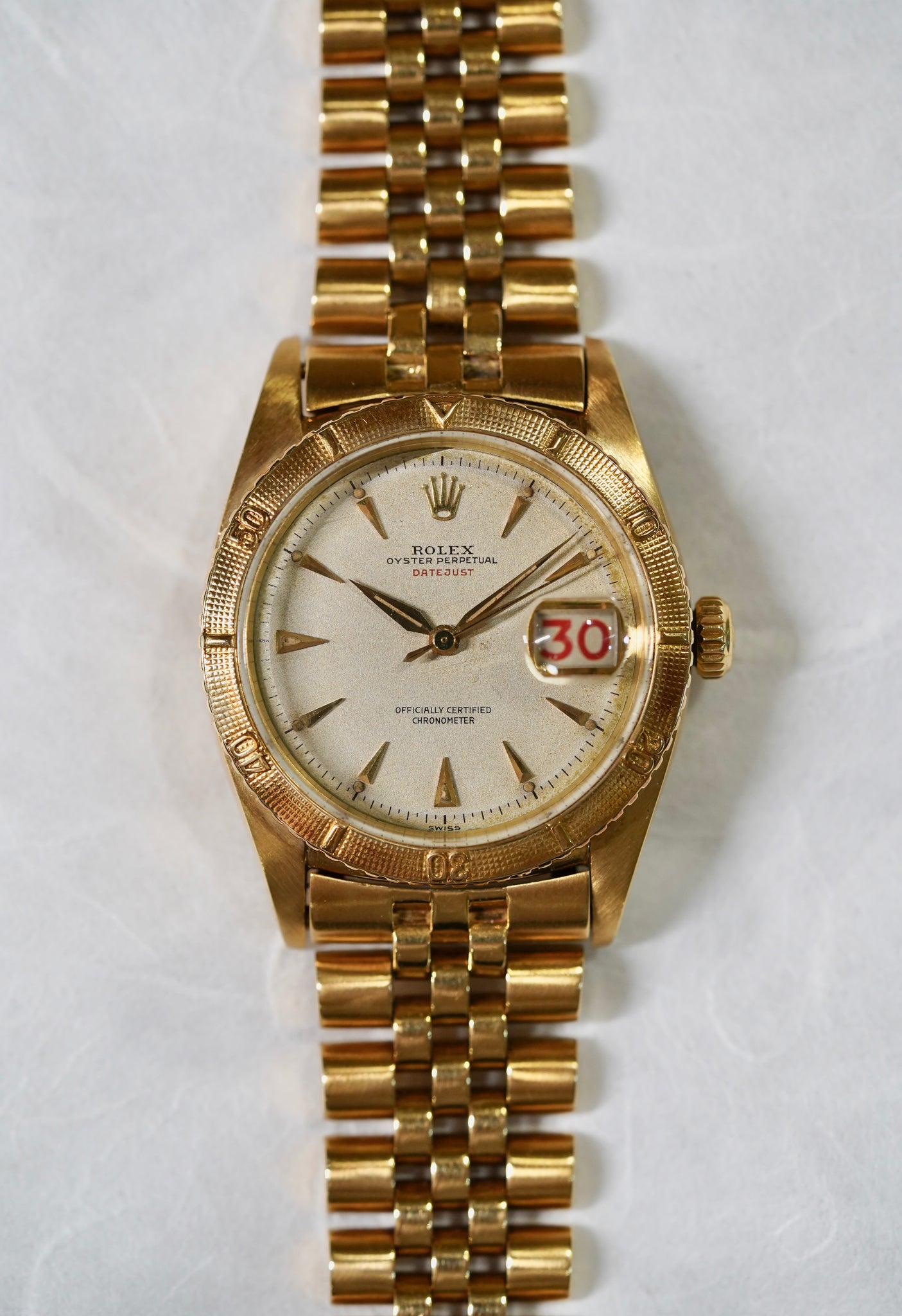 The Rolex Turn-O-Graph Ref. 6309 is one of the earliest and most distinctive executions of Rolex’s pioneering rotating bezel tool watch, introduced in the early 1950s. First unveiled in 1953 with the reference 6202, the Turn-O-Graph was Rolex’s very first serially produced wristwatch to feature a rotating bezel, establishing the foundation for later professional icons such as the Submariner and the GMT-Master. This specific turn o graph here is cased entirely in solid 18K yellow gold, represents the most luxurious interpretation of this historic model, which was also used in the U.S Air Force Demonstration Squadron, the "Thunderbird" (ref.6609). Measuring in at 36 mm, the Oyster case combines sporting utility with the richness of polished gold, while the fluted rotating bezel provides both a practical timing function and a bold stylistic contrast. The engine behind the watch is the Calibre A260, Rolex’s robust self-winding movement of the era, renowned for reliability and precision. The 6309 in yellow gold has got that rarity as well as historical importance, often considered a transitional piece bridging Rolex’s classic Oyster Perpetuals and its later professional sports watches.